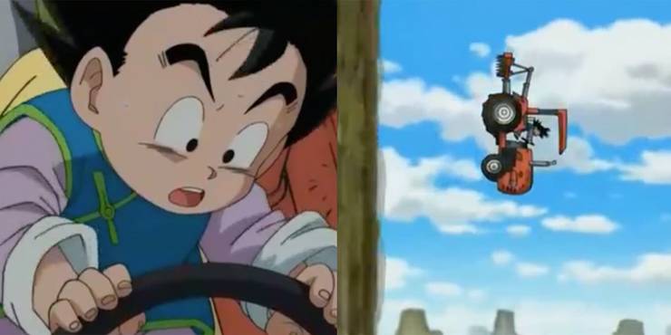 Goten bietet seinem Vater an, eine Weile den Traktor zu fahren, damit Goku auf dem Feld trainieren kann. Doch Goten fährt den Traktor in eine Klippe und zwingt Goku, ihn zu retten. Goten ist hier in zweierlei Hinsicht geistesabwesend: Er hat die verdammte Klippe nicht kommen sehen, und er wäre fast gestorben, weil er irgendwie vergessen hat, dass er fliegen kann und superstark ist. Ernsthaft, das wäre ein dummer, dunkler Tod für den jungen Halb-Saiyaner gewesen.